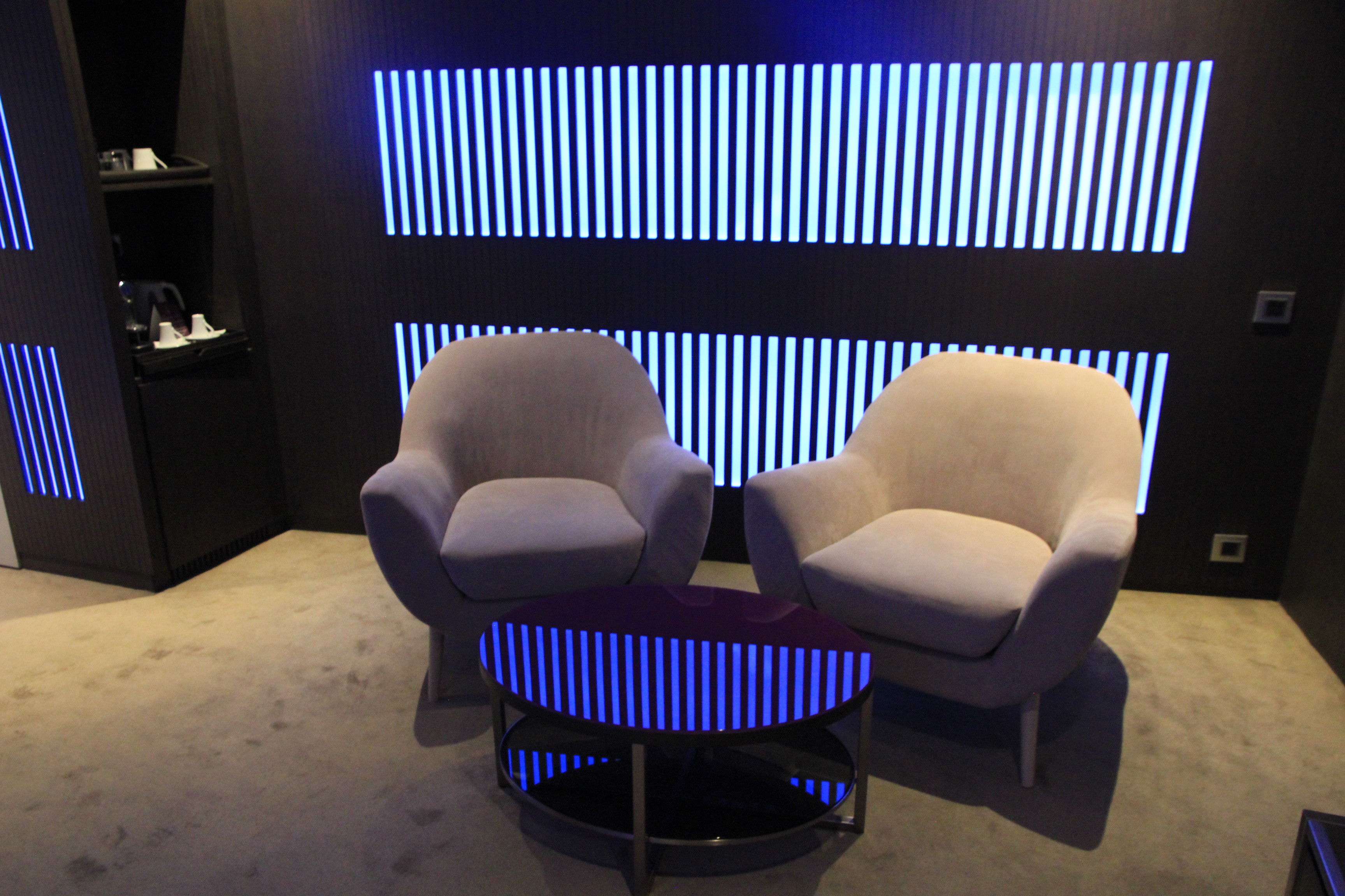 Mein Zimmer hat sich im 12 Stock des Hotels befunden. Mein Double Deluxe Zimmer befand sich links vom Fahrstuhl. Wenn man das Zimmer betritt, dann fällt einem sofort die moderne Gestaltung des Zimmers auf. Die Wandverkleidungen sind aus dunklem Holz und sind indirekt beleuchtet. Die Farben der Beleuchtung lassen sich übrigens nach eigenem Geschmack verstellen und anpassen.