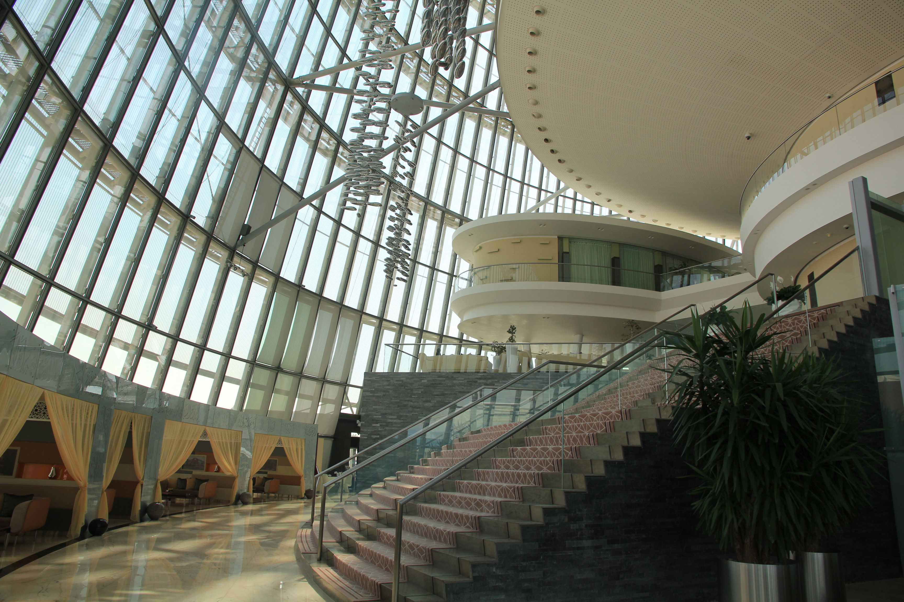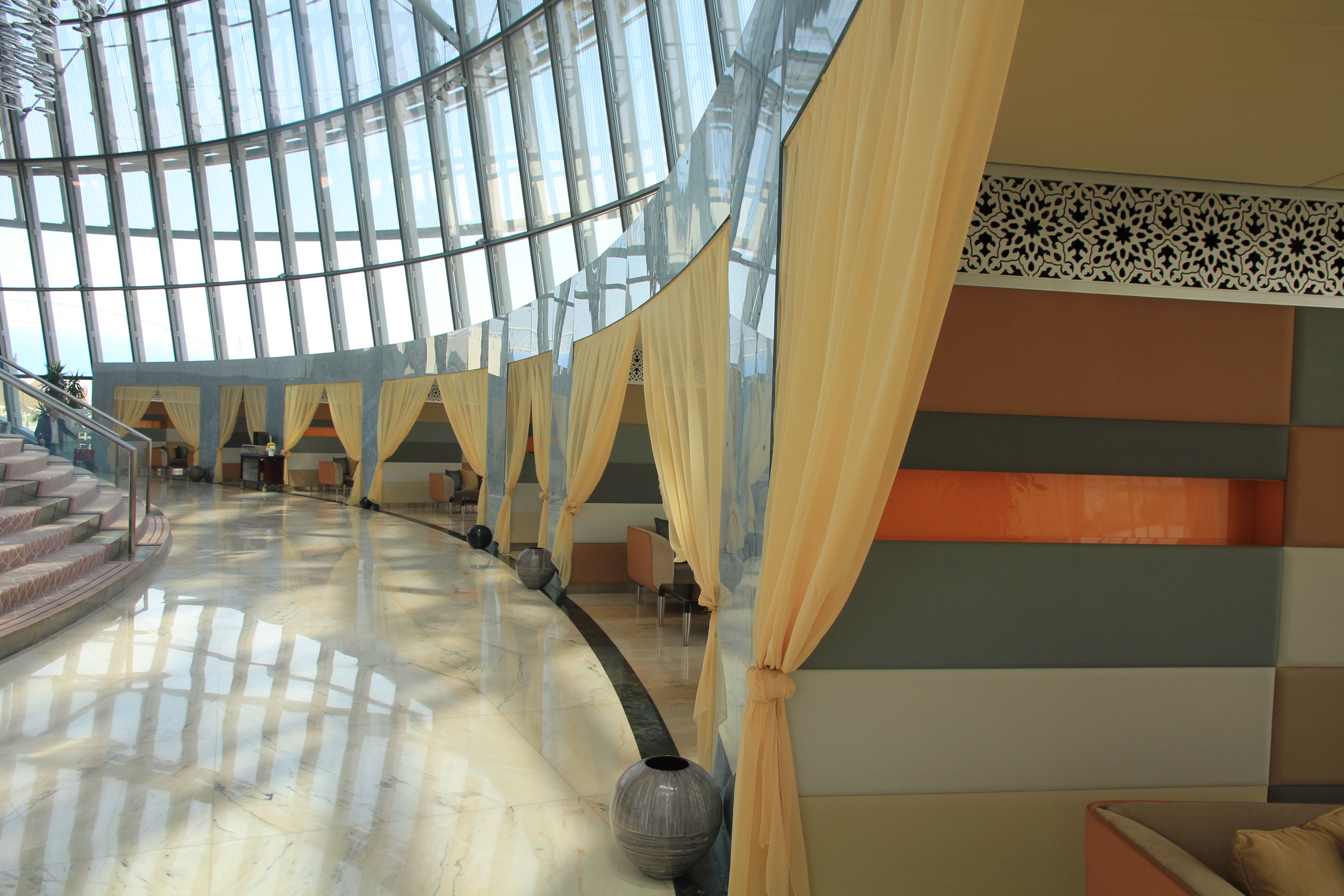 Man läuft einige Meter durch die riesige Lobby um zu den Fahrstühlen zu gelangen. Vom Design und der Architektur her ist das The Torch Doha absolut klasse. Auf der rechten Seite befinden sich Sitzecken, die im arabischen Stil gehalten sind. Hier kann man seinen „Afternoon Tea“ einnehmen oder einfach eine Kleinigkeit essen.
