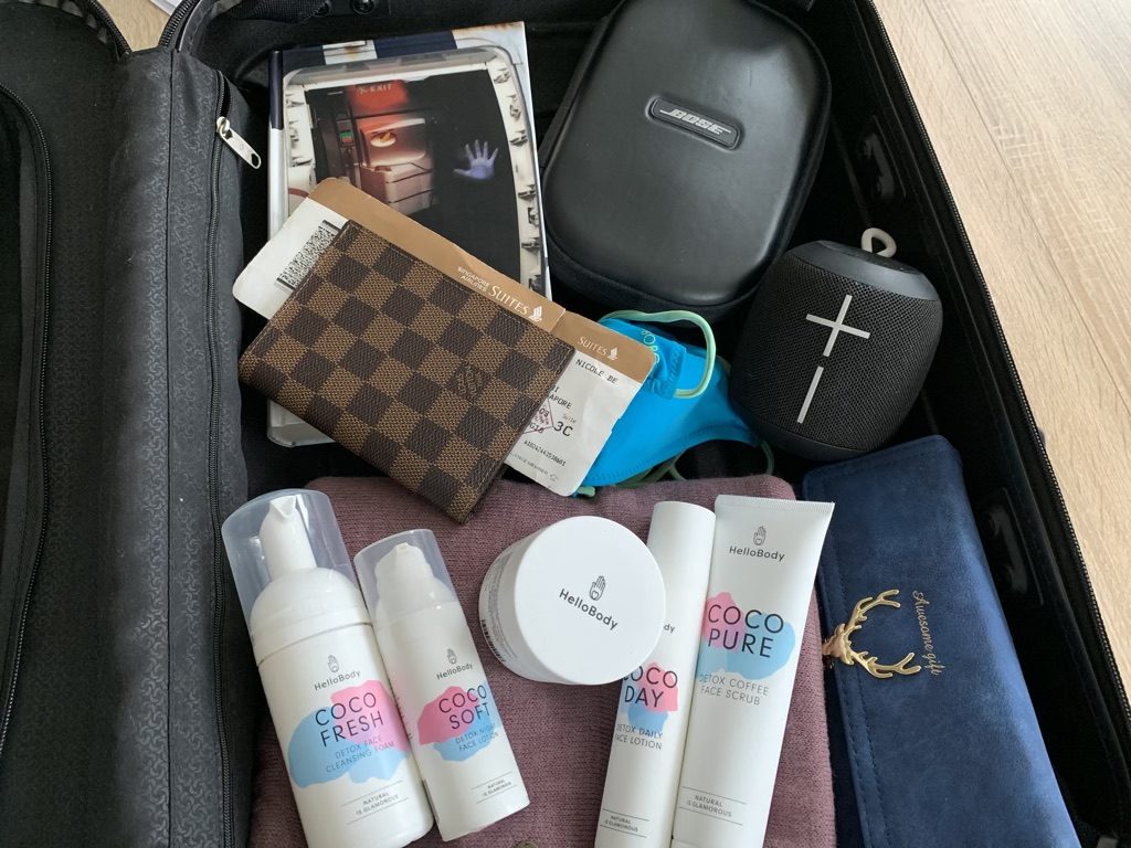 Ob du es glaubst oder nicht, mein Handgepäck sieht tatsächlich so aus. Kosmetik habe ich noch nie umgefüllt, sondern eher passende Größen gekauft. Wer mich kennt weiß, dass ich ohne Musik nicht richtig funktioniere – weswegen die Box mich meistens begleitet.