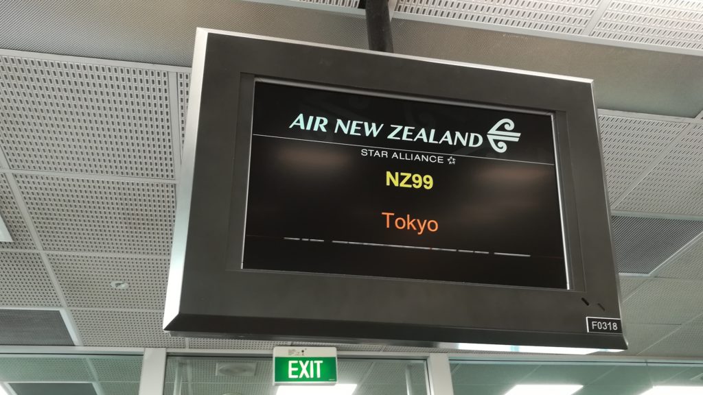 Pünktliche war die Landung in Tokio-Narita. Die dann endlos lange Rollzeit zum Terminal machte uns etwas nervös, denn wir hatten nur eine Stunde zum Umsteigen. So wurde es hier das erste und einzige Mal auf der gesamten Reise stressig. Das Ankunftsgate lag zwar relativ nahe zum Abfluggate, musste aber erst mal gefunden werden. Nach einigen Rolltreppen auf und ab sowie flotten Schritten auf den langen Laufbändern kamen wir nass geschwitzt am Abfluggate an, wo das Boarding schon begonnen hatte.