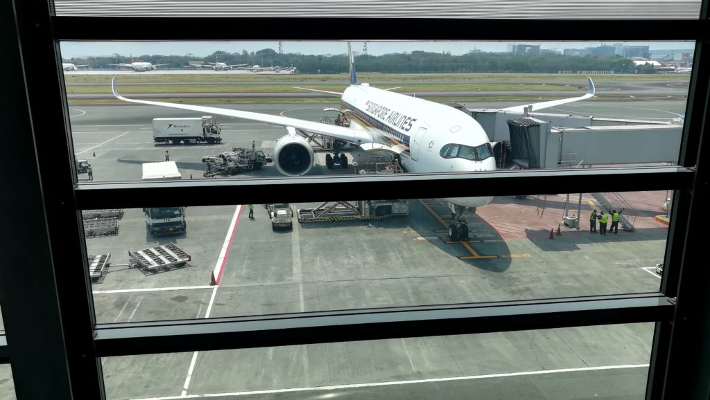 Nach einer Woche zurück am NAIA fanden wir wieder ein ruhiges und ziemlich leeres Terminal 3 vor, so dass der Check-In bei Singapore Airlines, der Ausreisestempel im Pass und auch die Sicherheitskontrolle schnell erledigt waren. Auf der Strecke nach Singapur setzte die Airline einen ziemlich neuen Airbus A350-900 ein, bei dem ich mit dem Sitzplatzangebot total unzufrieden war. Enge Sitze und wenig Beinfreiheit machten den 3-Stunden-Flug zu keinem großen Erlebnis. Das bestätigte meine Erfahrungen mit Singapore Airlines bei Flügen im asiatischen Raum. Hier scheint die Airline nicht den Wert auf die Qualität zu legen, die sie sonst auf den Strecken nach Europa bietet.
