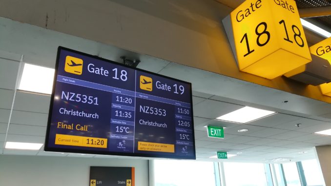 Besonders erstaunlich, es gab keine Sicherheitskontrolle. Warum allerdings die Flugbegleiter der Air New Zealand nach dem Boarding die geschlossenen Gepäckfächer mit einem Spray behandelten, hat bei mir bis heute keine Erklärung gefunden (vielleicht Biosecurity). Hatte das bisher noch nie auf einem Flug erlebt.
