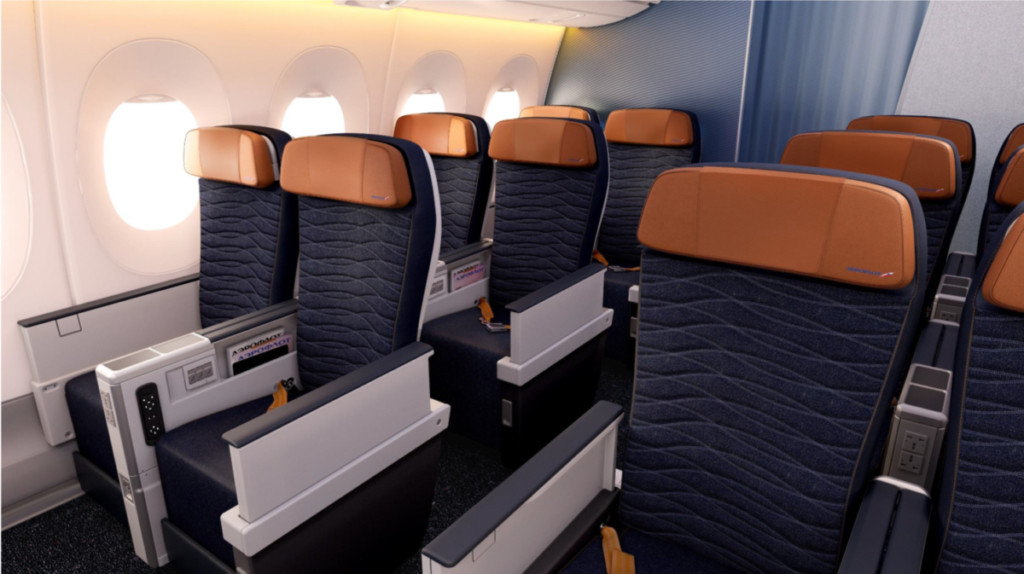 Auch eine Premium Economy Class gibt es an Board des A350. Darin sind acht Sitze pro Reihe in einer 2-4-2-Konfiguration verbaut. Mit nur drei Reihen und somit insgesamt 24 Sitzen wird die Premium Economy Class damit kleiner als die Business Class.