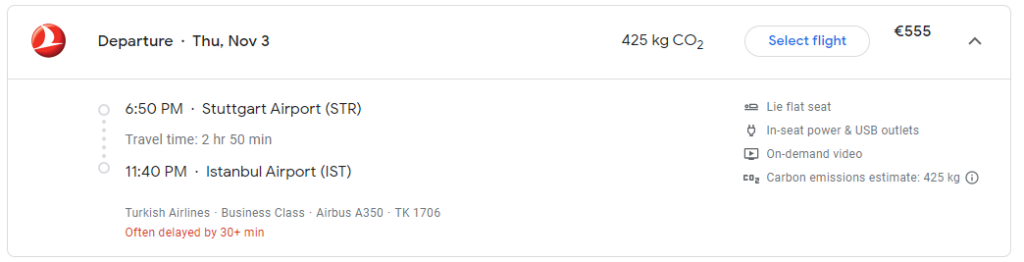 - Donnerstags (ab 3.11.2022) | TK1705 | Istanbul (IST) – Stuttgart (STR) | Abflug 16:15 Uhr | Ankunft 17:15 Uhr