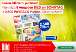 Mit dem 8 Wochen Abo der Bild am Sonntag könnt Ihr 2.000 Paybackpunkte/ Miles&More Meilen mitnehmen. Bei Zahlung per Bankeinzug, erhaltet Ihr 500 Punkte extra. In Summe also 2.500 Paybackpunkte.