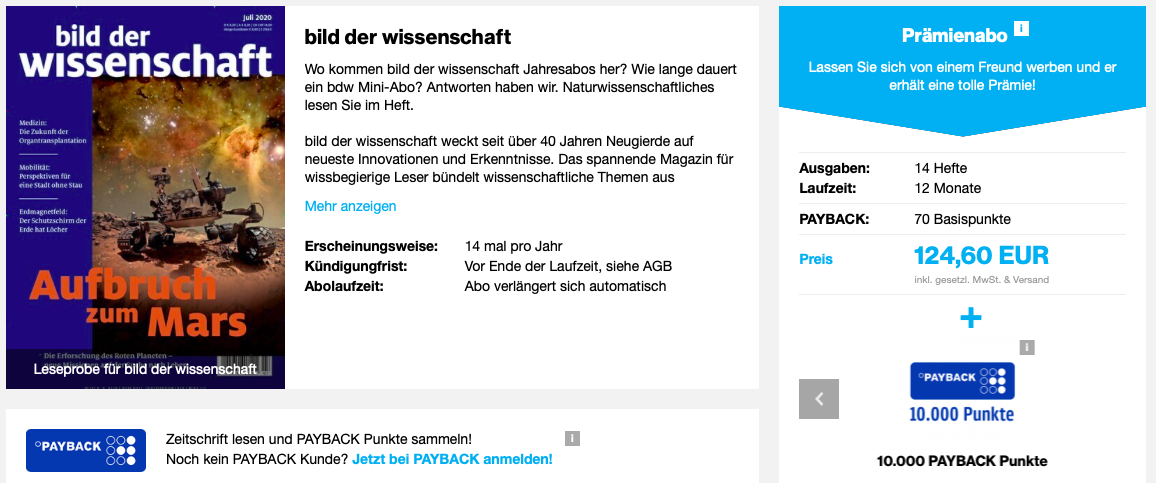 Gerade bietet man drei sehr lohnende Abos an, mit welchen man auf einen Schlag über 43.000 Payback Punkte und damit auch Miles&More Meilen sammeln kann. Insgesamt kann man sogar 43.310 Payback Punkte, vor einem möglichen Bonus für den Transfer zu Miles&More. Hier gibt es regelmäßig zwischen 10% und sogar 25% Bonus Meilen.