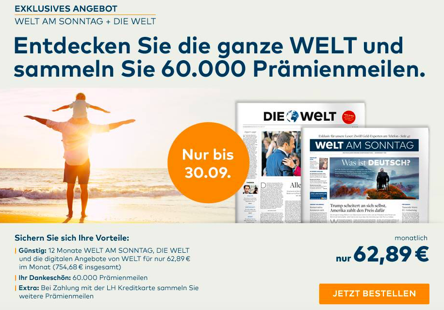 Hier geht es zum WELT +  WELT am Sonntag 12 Monats Abo über 60.750 Meilen