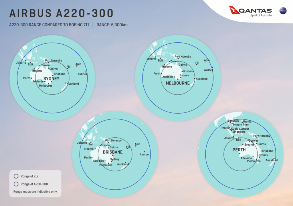 Wirklich beeindruckend ist aber auch die Range Map des Airbus A220-300 für Qantas. Hier sieht man wie viele neue Optionen sich für die Airline mit dem neuen Flugzeug auf regionaleren Strecken auftun werden.