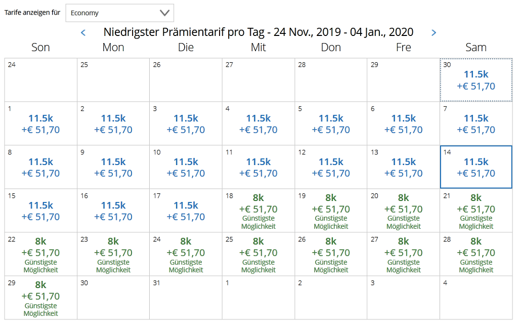 In meinem Beispiel wären es Flüge mit der Lufthansa von Frankfurt nach München (Hinflug) und von Frankfurt nach Hamburg (Rückflug). Dazwischen ein Flug von Shanghai nach Peking. Für alle Flüge in der Economy Class zahlt man ab 30 Tage vor Abflug 16k Meilen. Ein sehr fairer Deal.