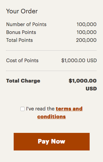 Wenn Ihr noch heute IHG Punkte kauft erhaltet Ihr 100% Bonuspunkte zusätzlich gutgeschrieben. 100.000 IHG Punkte + 100.000 kostenlose Punkte kosten 1.000 USD oder etwa 854 Euro.