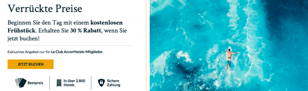 Gerade hat die Accor Hotel Gruppe einen Sale am Laufen, bei welchem man unter dem Namen „Verrückte Preise“, teilweise deutlich über 30% Rabatt auf die Zimmerpreise gibt. Zusätzlich schenkt man Euch auch noch das Frühstück für zwei Gäste dazu, wodurch das Angebot noch interessanter wird.