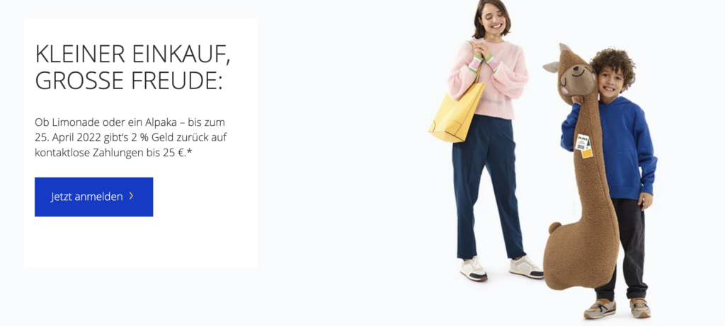 KLEINER EINKAUF, GROSSE FREUDE: Ob Limonade oder ein Alpaka – bis zum 25. April 2022 gibt‘s 2 % Geld zurück auf kontaktlose Zahlungen bis 25 €.