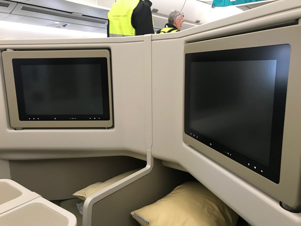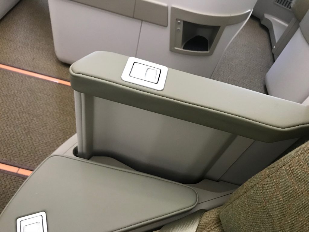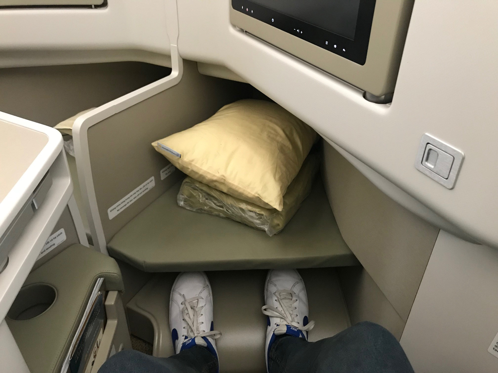 Zur besseren Privatsphäre und als kleinen „Schutz“ zum Gang, gibt es auch eine kleine ausfahrbare Wand, wie sie auch in diversen anderen Business Class-Produkten angeboten wird. Der Fußraum des Sitzes war völlig ausreichend und bot auch in der Liegeposition noch genug Platz.