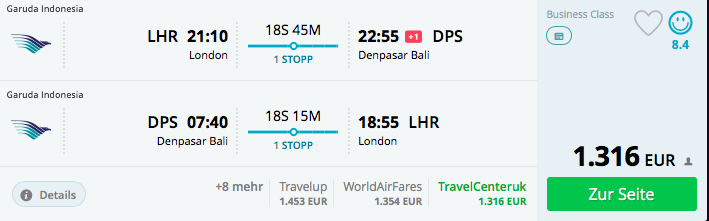 Da ist es einfach nur fantastisch, dass Garuda Indonesia tolle Angebote ab London nach Bali aufgelegt hat. Neben dem wahnsinnigen Angebot von 2455 Euro für Hin- und Rückflug in der First Class, könnt Ihr auch für sehr günstige 1.316 Euro in der Business Class komfortabel auf die paradiesische Urlaubsinsel Bali fliegen.