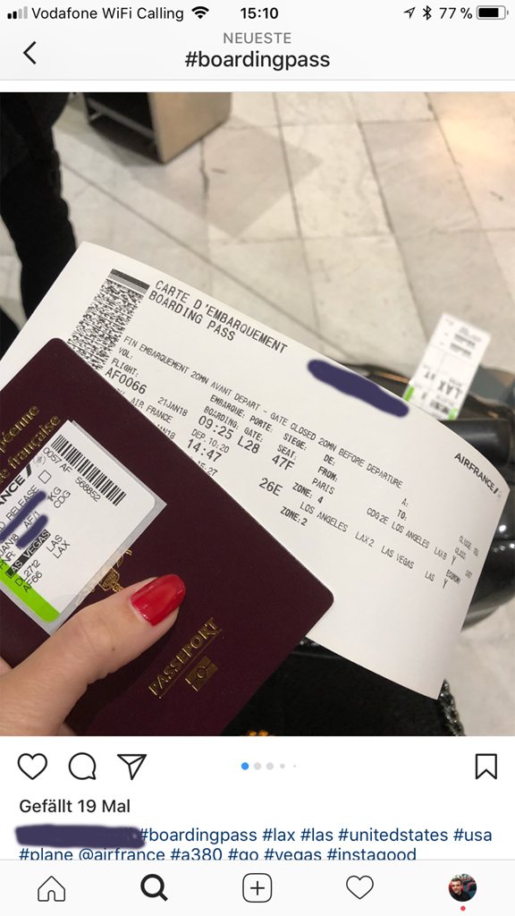 Zunächst habe ich einfach mal bei Instagram nach dem Hashtag „#Boardingpass“ gesucht und direkt nach einigen Augenblicken zwei „Kandidaten“ für meine beispielhafte Darstellung gefunden (zum Schutz sämtlicher personenbezogener Daten habe ich die „gefährlichen Stellen“ nachträglich zensiert).