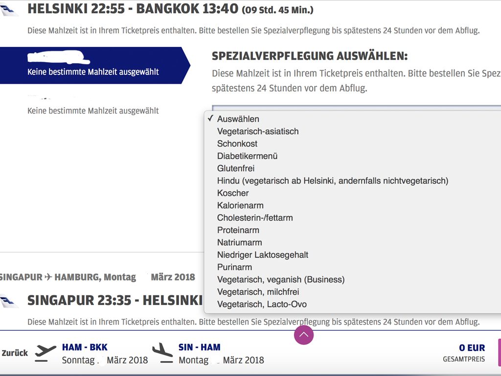 Zudem habe ich auch die Möglichkeit, für die Langstreckensegmente ein spezielles Menü vorzubestellen und Sitzplätze auszuwählen (bzw. nach dem Online-Check-In zu ändern).