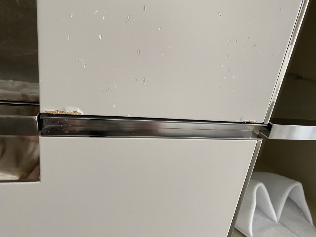 Der Schminktisch hat derartig viele Macken, das man ihn einfach tauschen sollten und ja, mir ist bewusst, wie schnell sich Hotelmöbel abnutzen. Aber von einem Waldorf Astoria erwarte ich mehr, als von einem Hampton und selbst in einem Hampton würde ich diesen Tisch sehr kritisch beäugen.