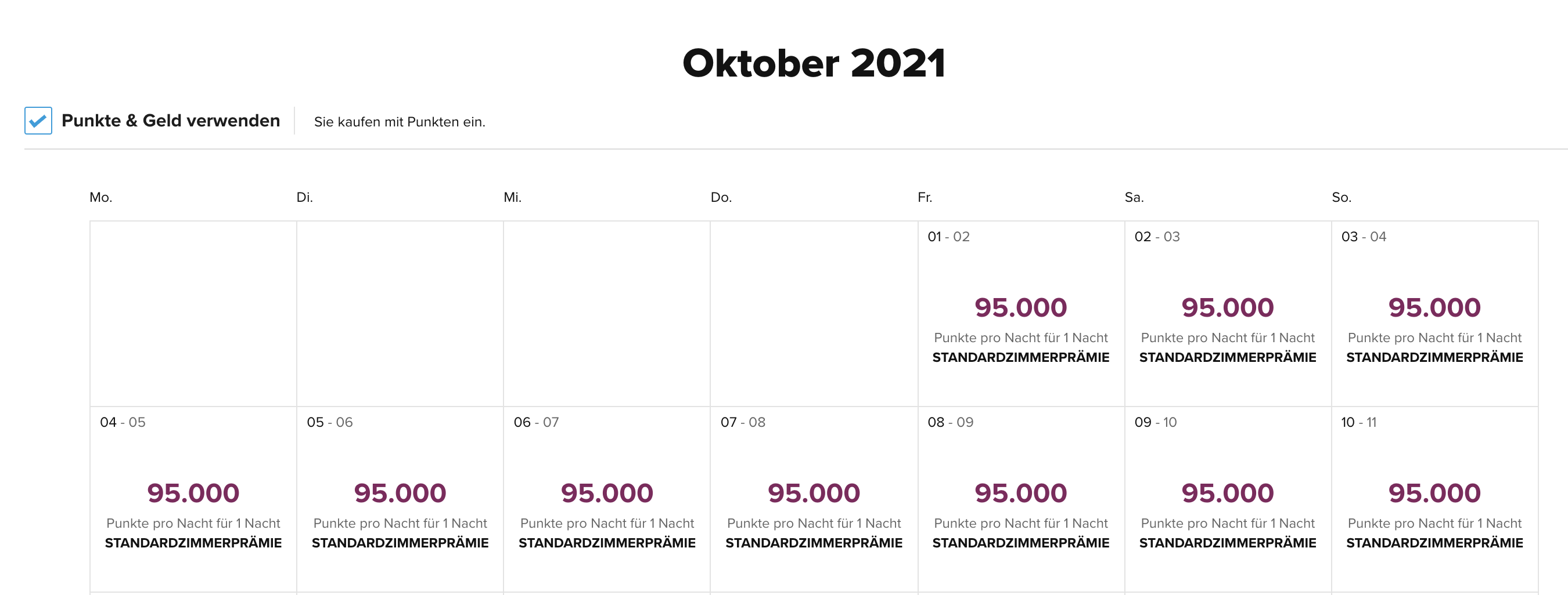 Hier ein Beispiel des Hilton Berlin, an dem man diesen Unterschied erkennen kann. Eine Übernachtung kostet für den aktuellen Tag 34.000 Punkte oder 142€.