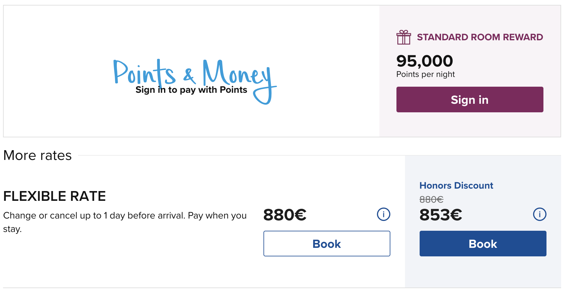 Hier ein Beispiel des Hilton Berlin, an dem man diesen Unterschied erkennen kann. Eine Übernachtung kostet für den aktuellen Tag 34.000 Punkte oder 142€.