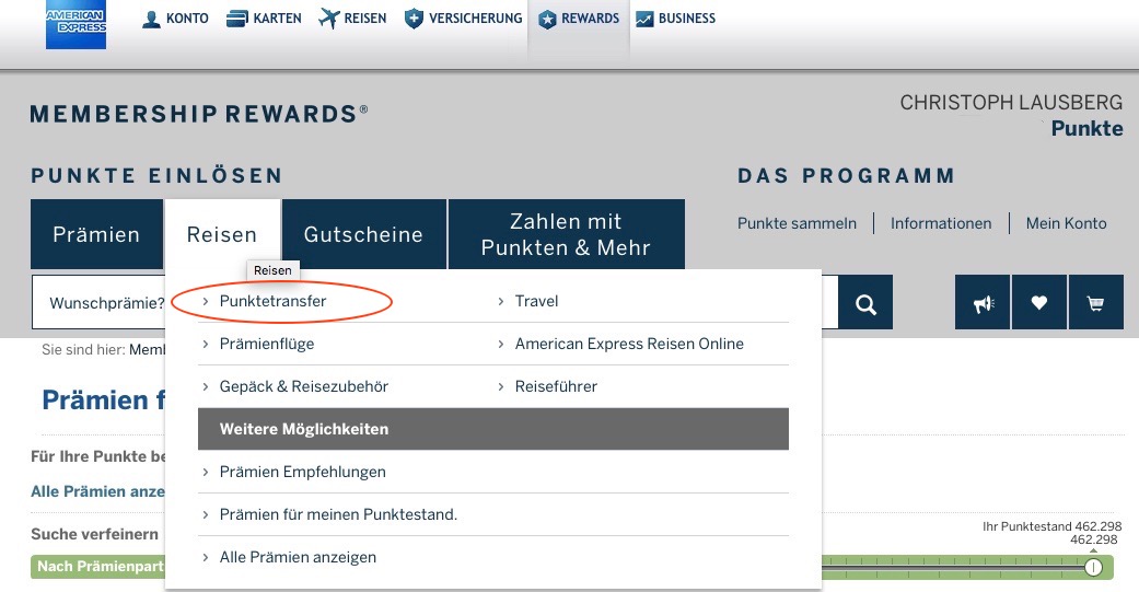 Der Punkte Transfer vom Membership Rewards Konto auf das Miles&More Konto ist denkbar einfach, allerdings muss er in zwei Schritten über Payback laufen. Als erstes transferiert man die Membership Rewards Punkte zu Payback. Hierzu loggt man sich einfach auf der AMEX Homepage in das Onlinekonto ein und geht auf die Membership Rewards Seite.