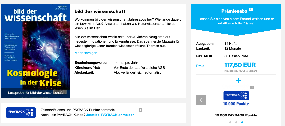 Grundsätzlich richten sich diese Payback Prämienabos an Leute, welche einen neuen Leser werben. Die Prämie erhält der Werber und die Zeitschrift der Geworbene. Dabei dürfen Werber und Geworbener nach AGBs nicht identisch sein, aber sie dürfen explizit im selben Haushalt wohnen. So könnt Ihr z.B. den Lebenspartner, einen Freund, Eltern, Kinder, Hunde, Katzen und Goldfische werben.